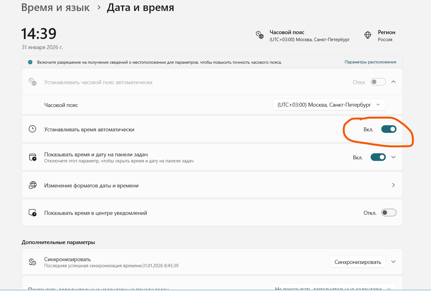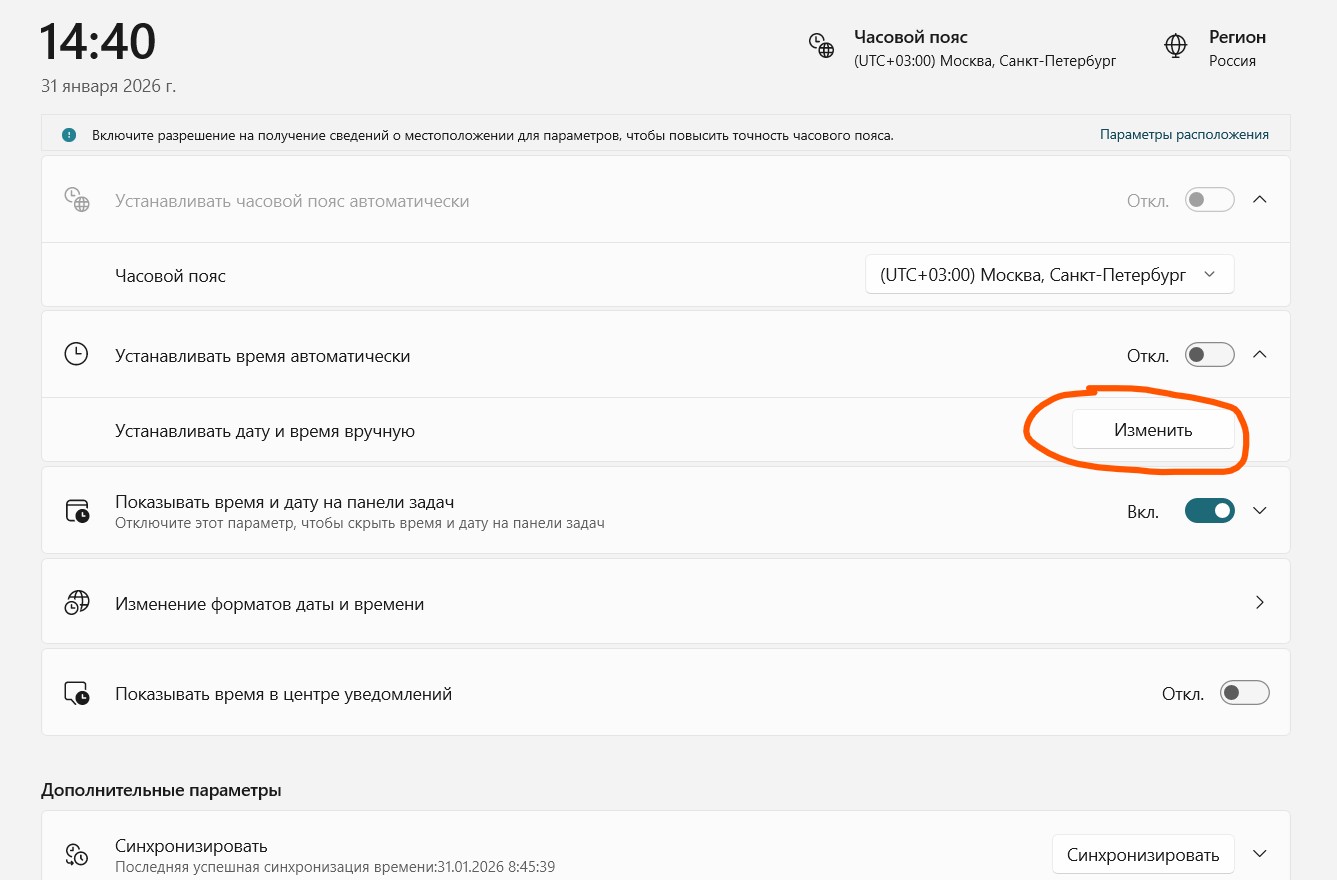 Если вы не используете VPN (а его нужно отключить, при использовании мессенджера MAX), и вы обновили страницу веб версии, а проблема осталась, то вероятно причина проблемы — неточные дата и время на компьютере. Чтобы это исправить, нужно включить автоматическую установку времени или задать его вручную. Проверить это можно сверив время на вашем компьютере и время из сети. Например на сайте: time100.ru/Russia. Если время не совпадает, то далее напишу короткую инструкцию, как настроить время.