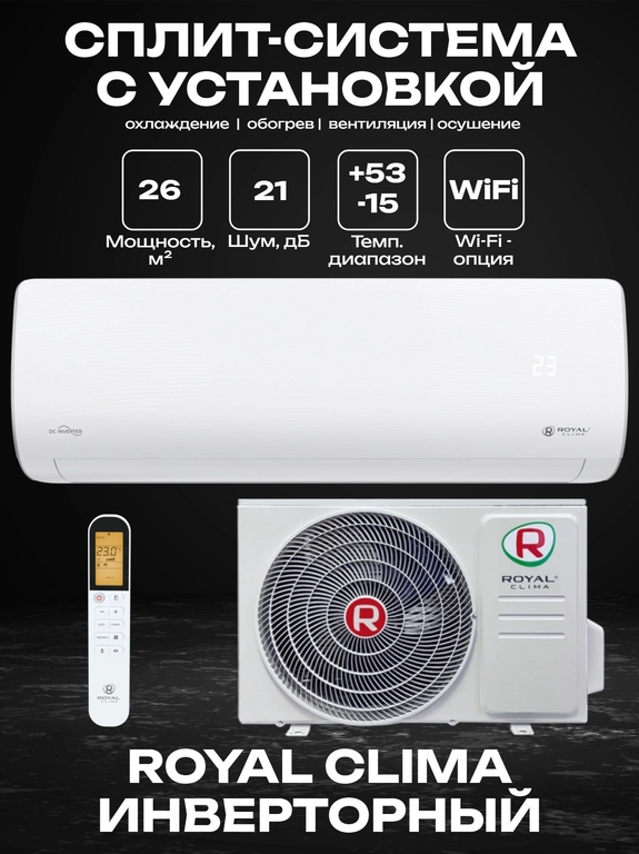 Кондиционер Royal Clima RCI-AR28HN – сплит-система, которая обладает высокой производительностью и энергоэффективностью. Оборудование обеспечивает равномерное охлаждение или нагрев помещения за короткий промежуток времени, но при этом потребляет минимум электроэнергии. Опционально возможна установка дополнительного Wi-Fi модуля, позволяющего комфортно управлять устройством прямо со смартфона.
